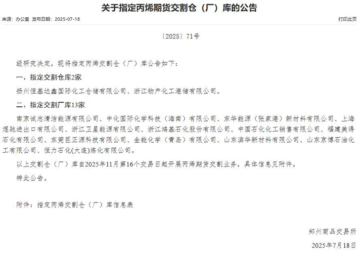 7月18日,東莞巨正源科技有限公司繼成為大連商品交易所(以下簡(jiǎn)稱“大商所”)聚丙烯期貨指定廠庫后,憑借在化工領(lǐng)域的專業(yè)實(shí)力與產(chǎn)業(yè)協(xié)同,成功通過鄭州商品交易所(以下簡(jiǎn)稱“鄭商所”)的嚴(yán)格評(píng)審,正式成為鄭商所丙烯期貨指定廠庫。